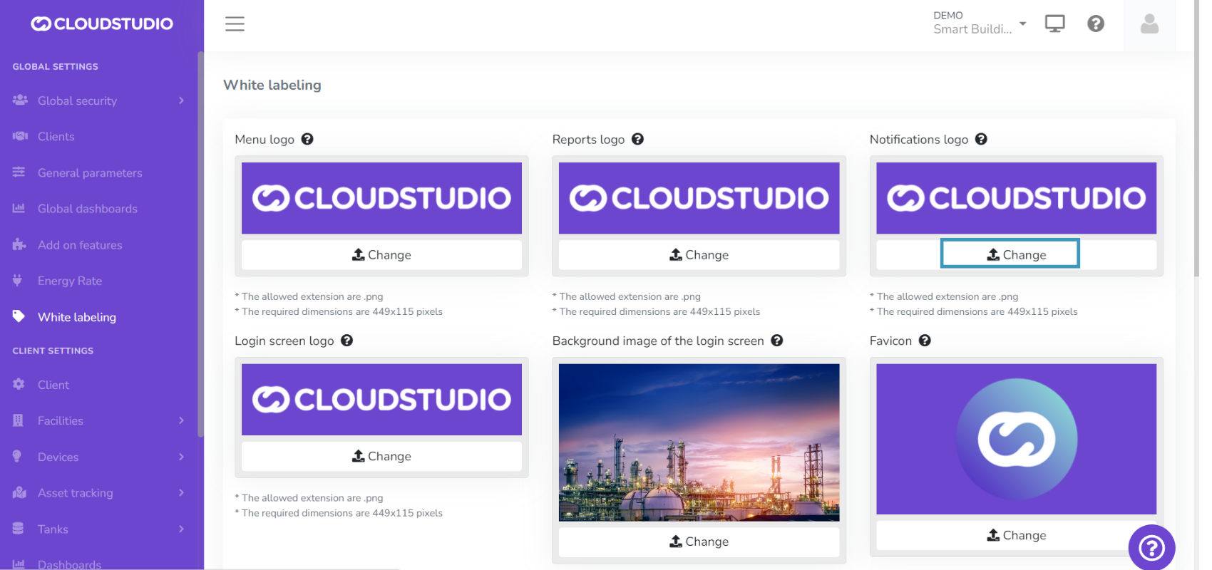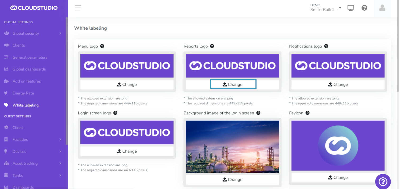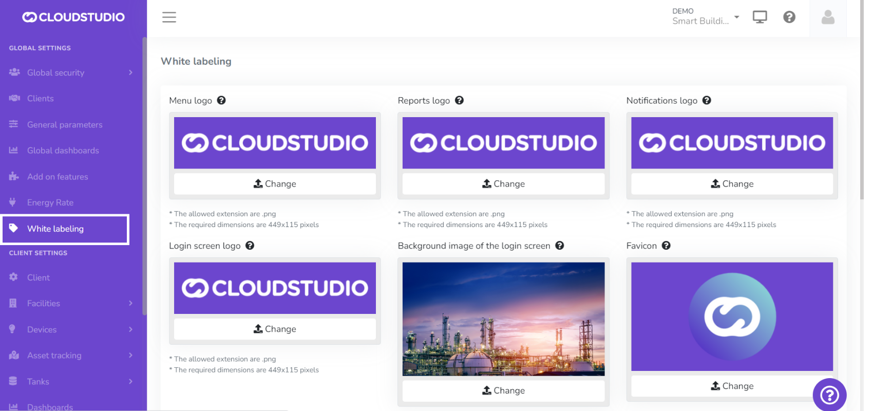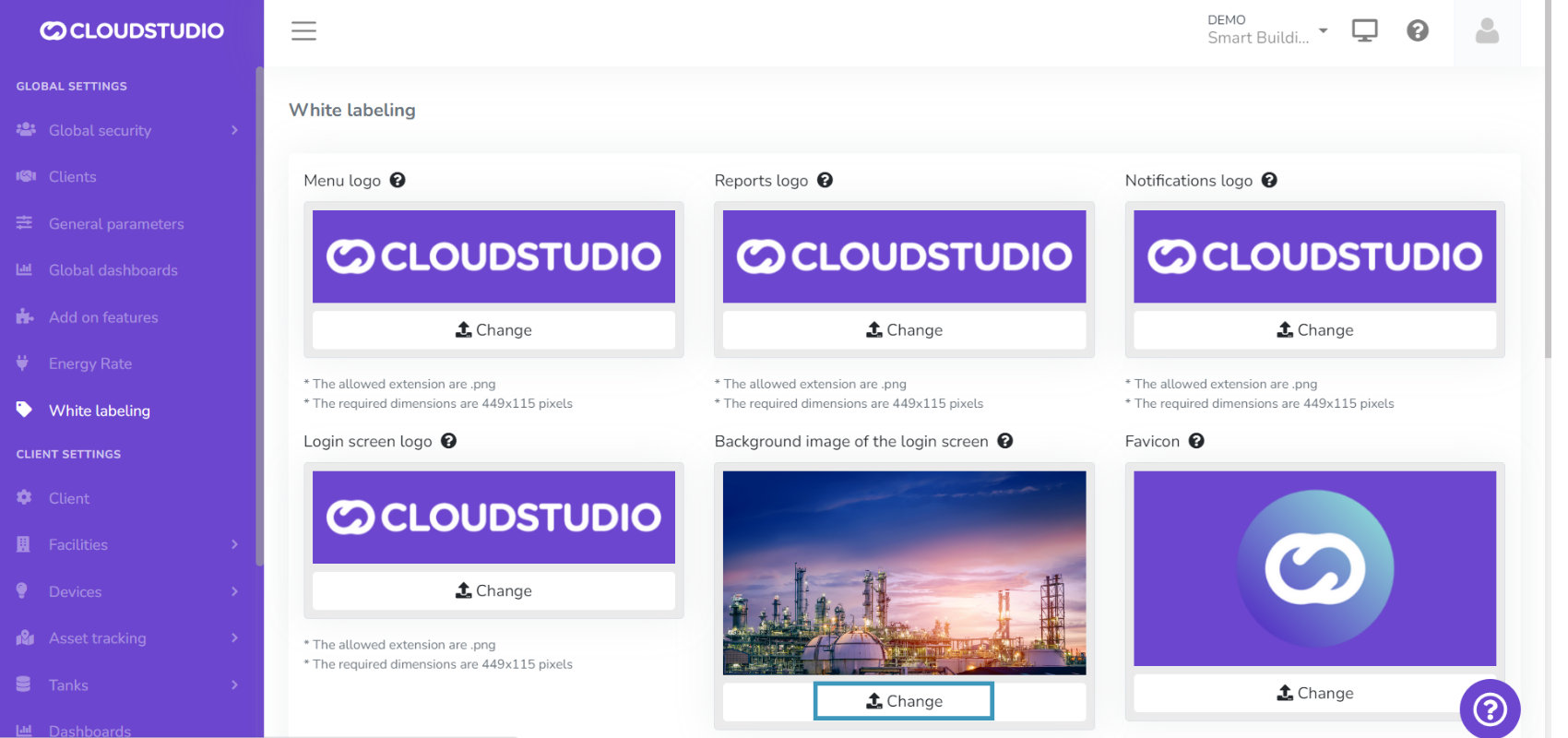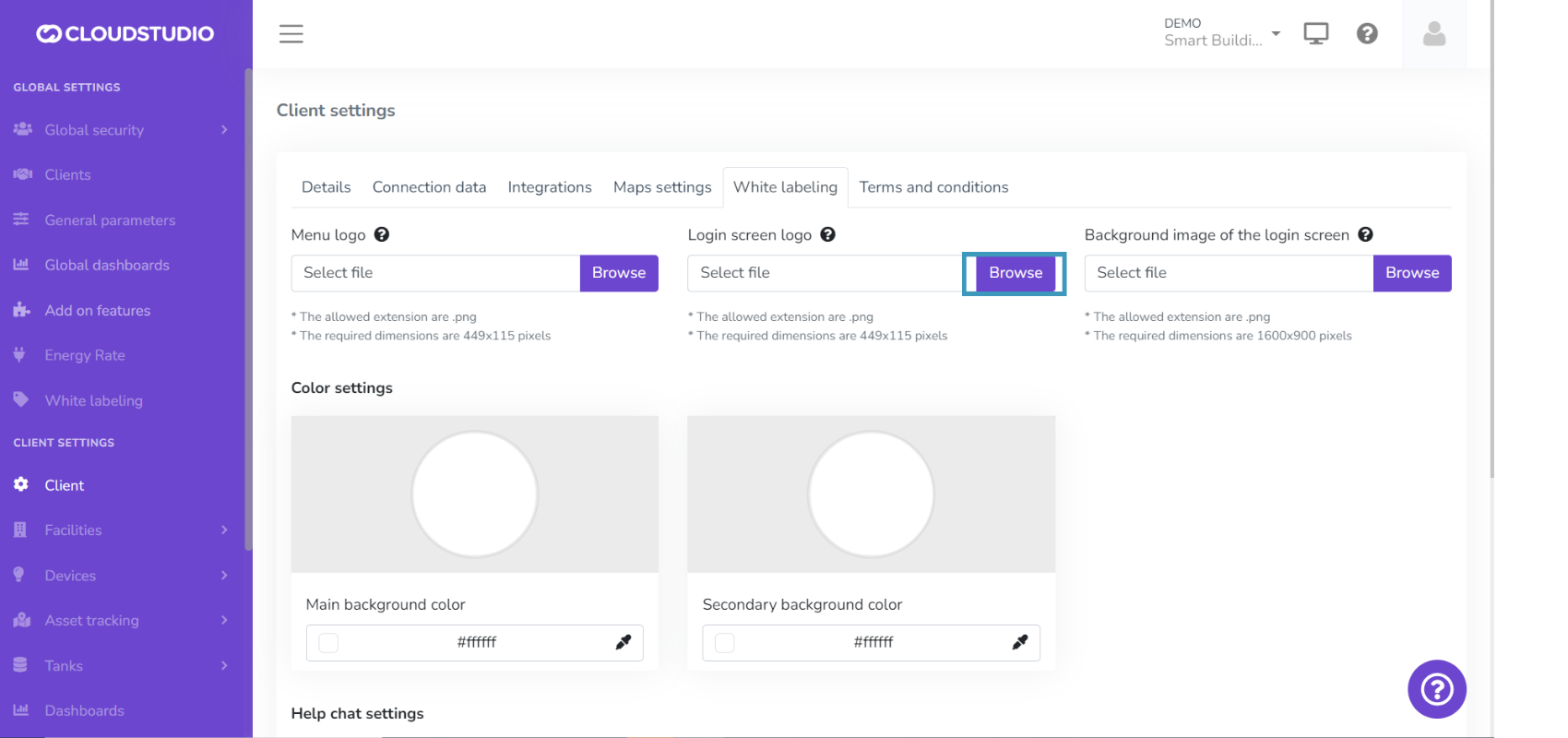 The White Labeling feature gives users the ability to customize the platform, creating a unique usage experience that adapts to their brand identity. From this section, you can customize the logo in the menu, reports, notifications, and login screen. It also provides color palette selection, login screen background image, and chat and help page settings.