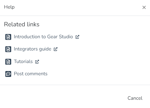 - If reset, the URL will be cleared and the default help menu will be shown ("Introduction to Gear Studio", "Integrator's Guide", "User Manual", "Deployments", etc.).