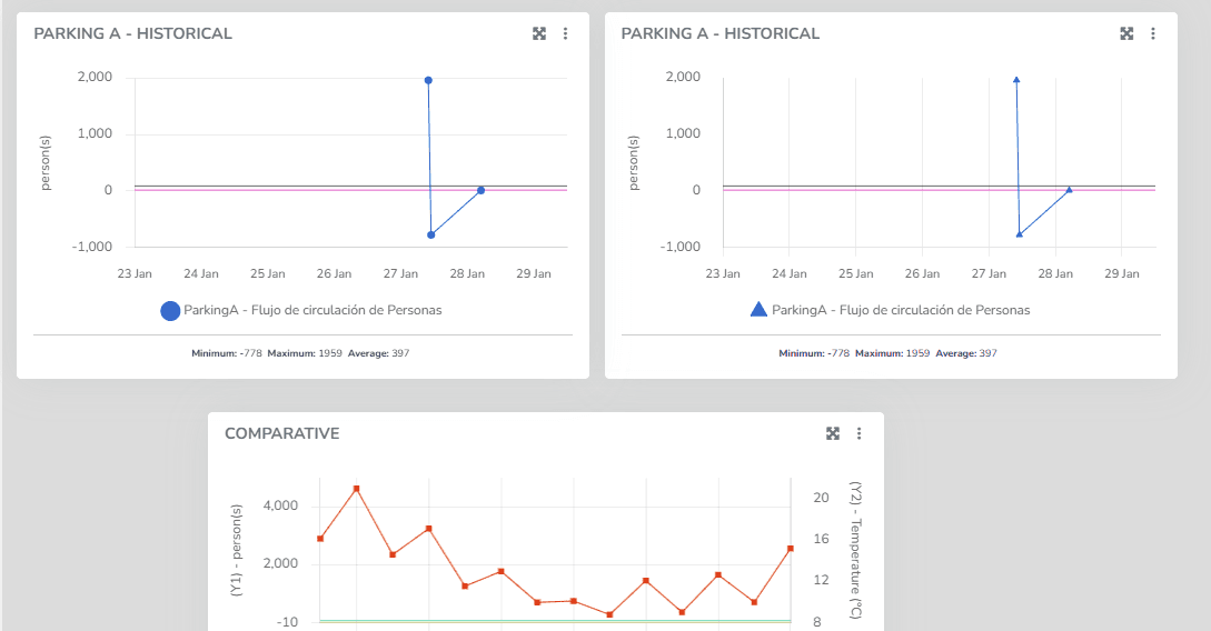 The platform includes predefined widgets that facilitate data presentation in dashboards. Among them are the history and comparative history widgets.