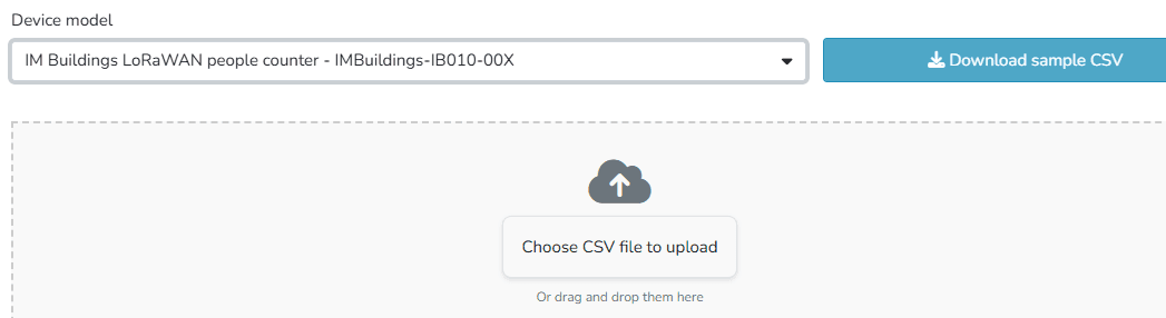 Before uploading, the platform offers a sample CSV file for download. This file contains the structure and columns needed to facilitate correct device entry. A sample file is generated for each registered device model, although you can later include devices of different models in the same file.