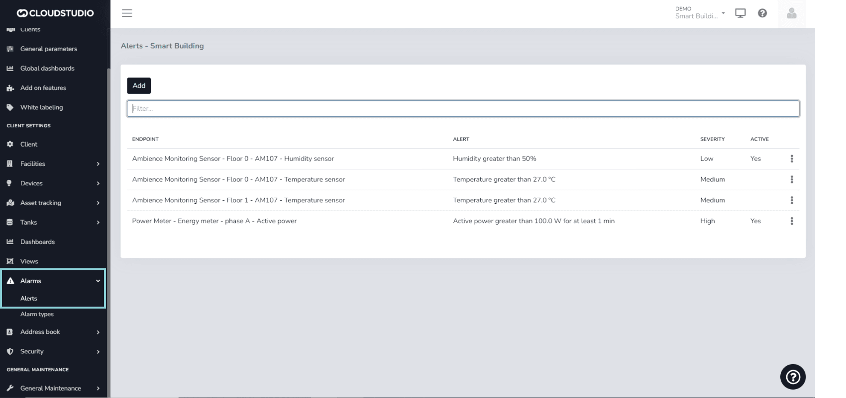 Alerts are applied to endpoints and allow you to define acceptable value ranges so that alarms are automatically generated when values fall outside these thresholds...