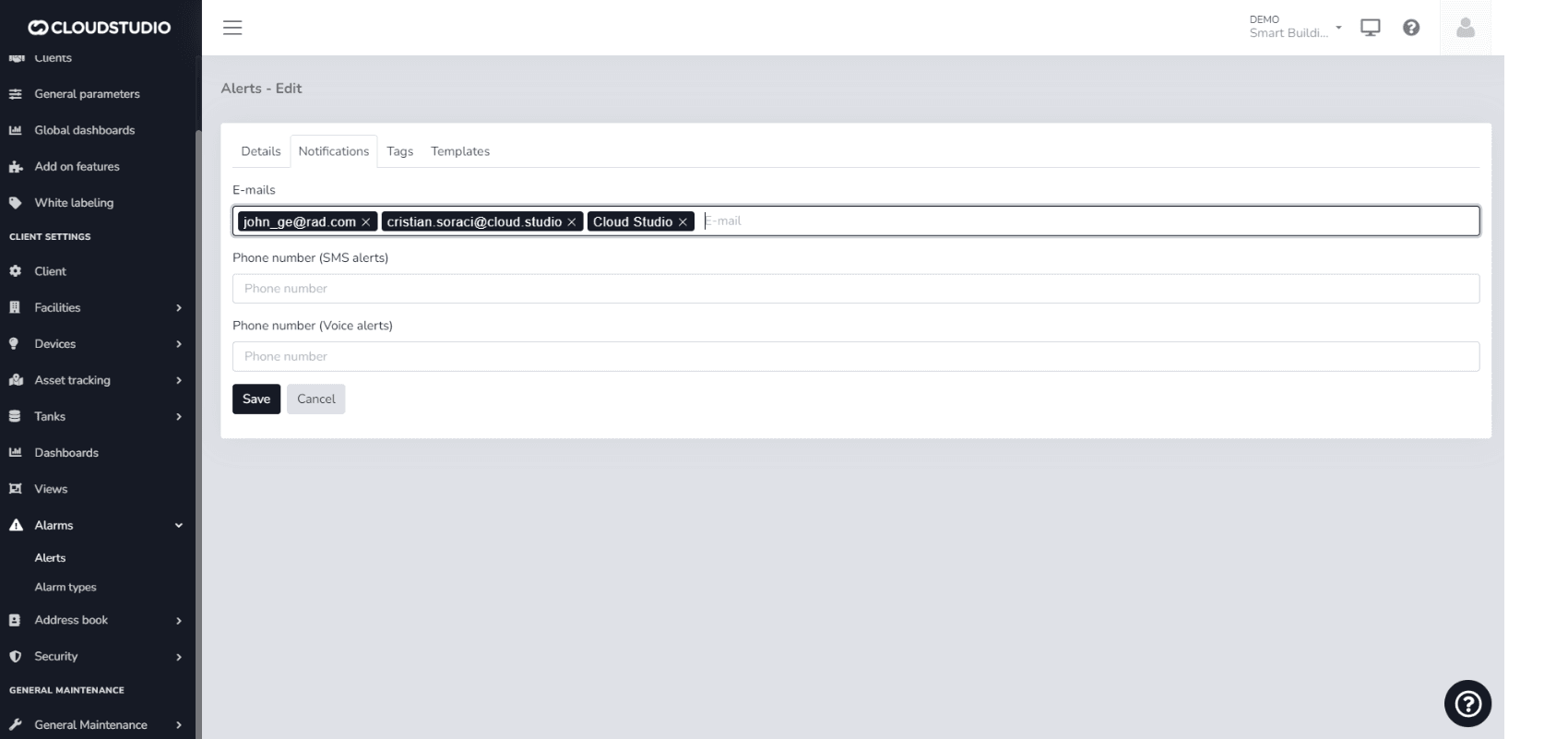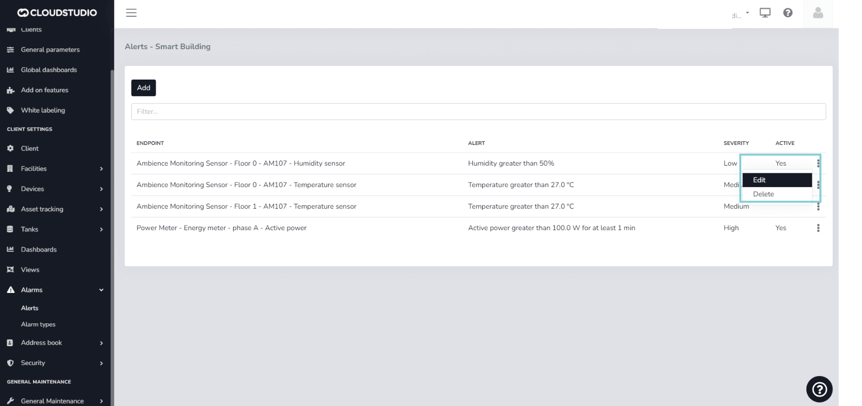 To edit alert notifications, go to Client Configuration > Alarms > Alerts.