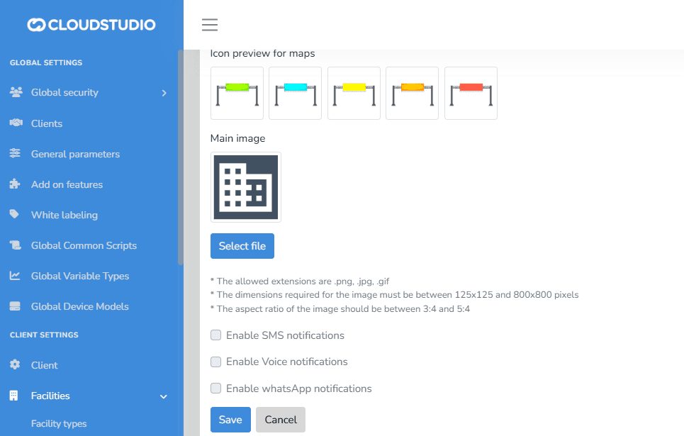 If enabled at the Client level, a user with administrator permissions can enable or disable SMS, Voice, and WhatsApp notification delivery at the Facility level, deciding which ones will be active.