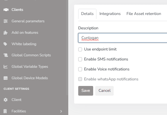 If the options are not enabled at the Client level, the user will see the options as disabled at the Facility level. That is, to enable voice, SMS, and WhatsApp notifications at the Facility level, they must first be enabled at the client level.