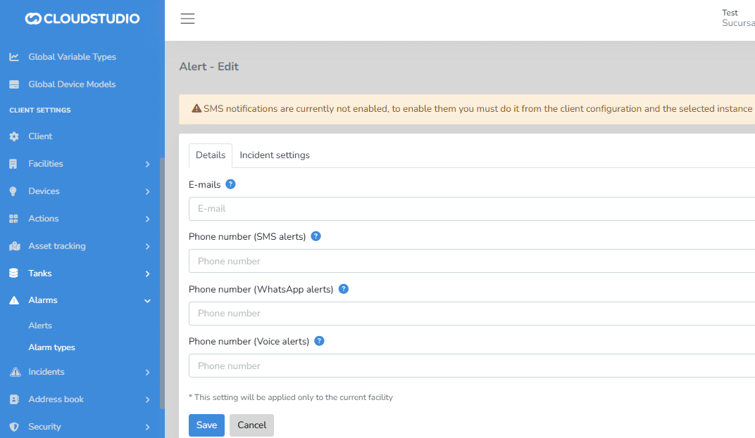 Alarms > Alert Types The Notification type configuration is also available for Alert Types. You can configure notifications via Email (no additional cost), as well as via text messages (SMS), voice messages, and WhatsApp, with additional cost