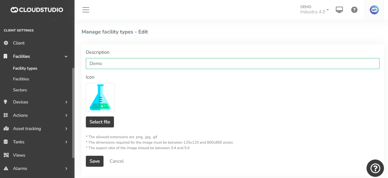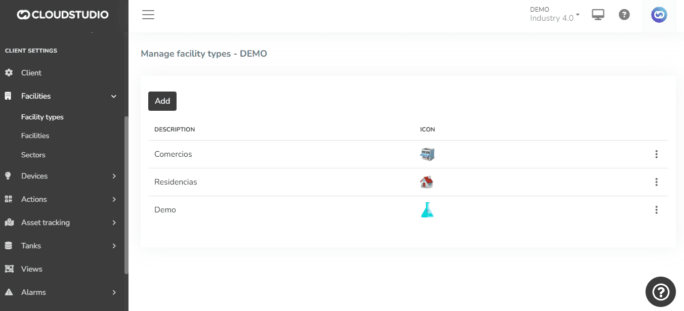 Facility types in the IoT context are categories that allow differentiating and grouping data according to the nature and function of the physical environments where connected devices and gateways are deployed. This parameter is essential for analyzing information in a differentiated and strategic manner. Each facility type can be associated with a representative icon, which will be visually reflected in the dashboard.