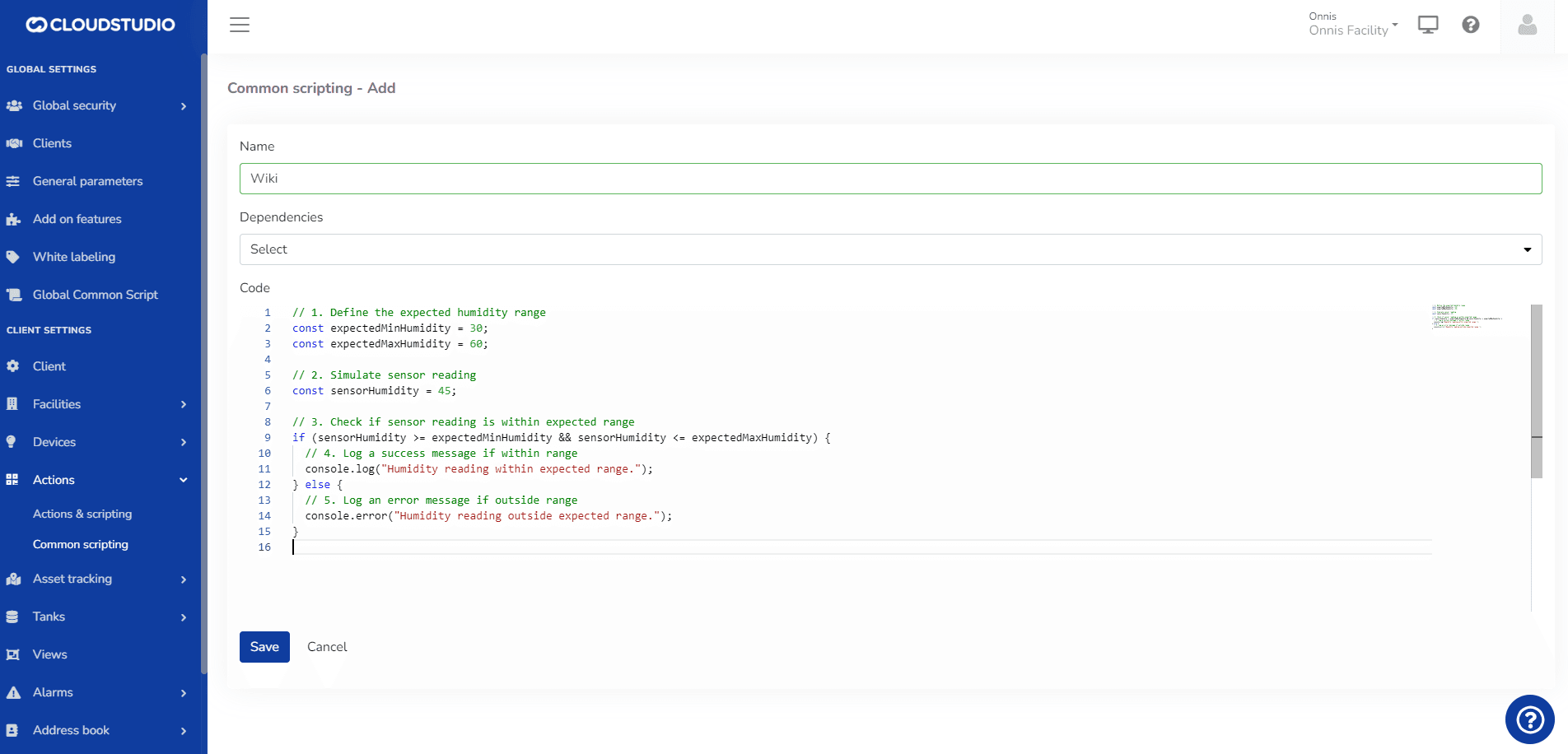 When selecting Add, the user can include a description, select a dependency, and enter the JS code below.