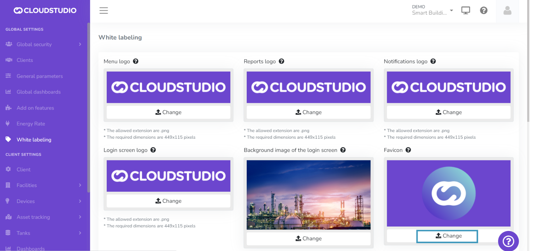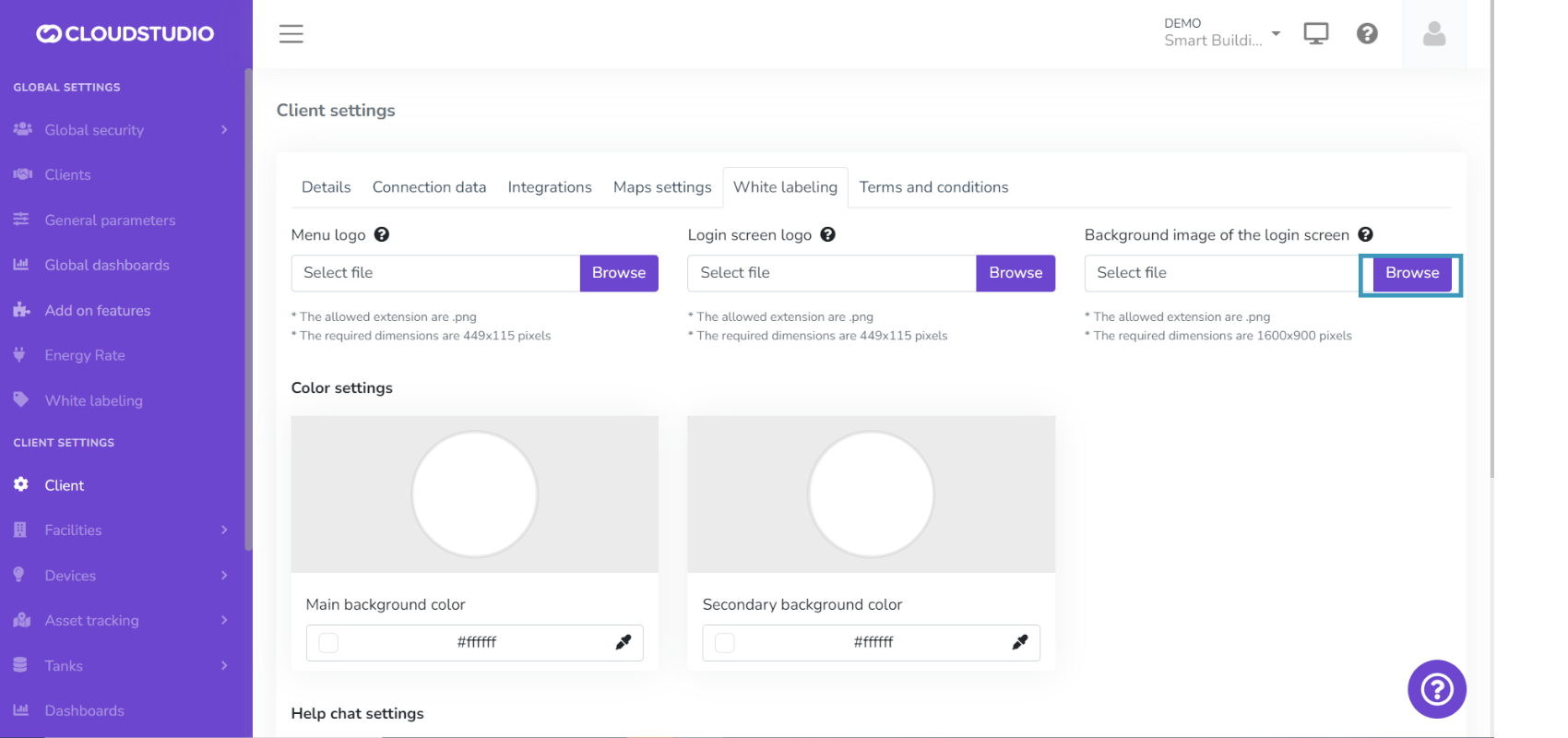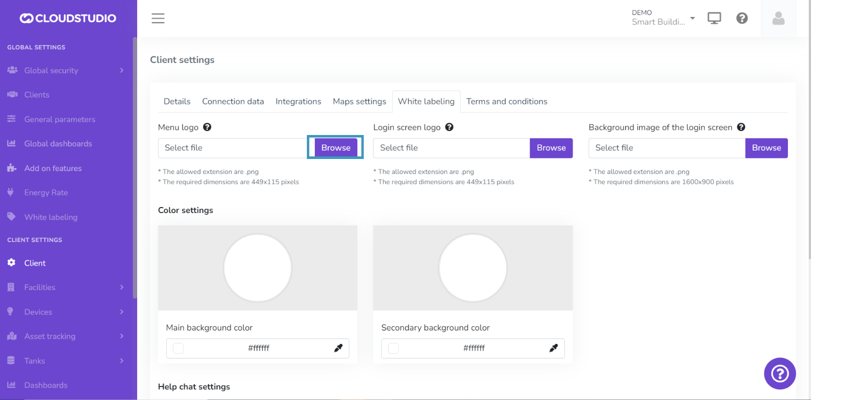 The White Labeling feature gives users the ability to customize the platform, creating a unique usage experience that adapts to their brand identity. From this section, you can customize the logo in the menu, reports, notifications, and login screen. It also provides color palette selection, login screen background image, and chat and help page settings.