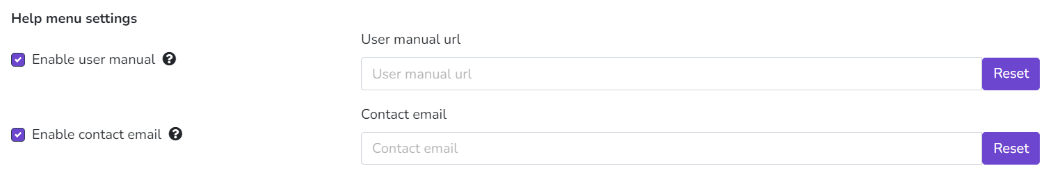 In this option, you can customize the help menu. You can set a contact email and a custom URL for the user manual. You can also choose to Disable these options or Reset them.